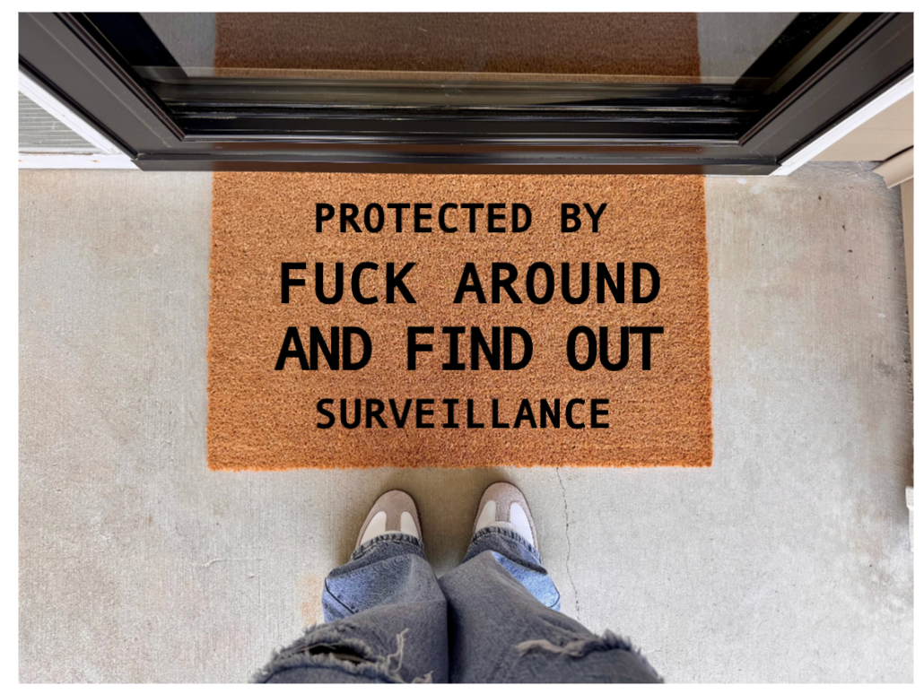 This surveillance doormat is not to be messed with. Its message to "F Around And Find Out" means we will protect our own without hesitation. Built to last, it will serve as a warning to potential intruders.