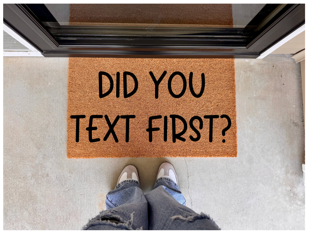 Enhance your entryway with our Did You Text First Doormat. Its playful yet snarky design adds personality to any home. Made with durable materials, this doormat is not only cute but also built to last. Let your guests know your sense of humor from the moment they step in.