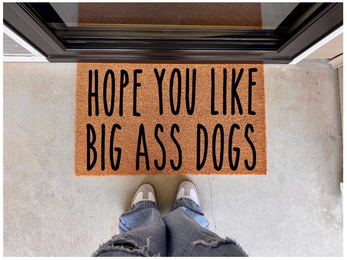 Introducing the "Hope You Like Big Ass Doormat" - the perfect addition to any home! Made for not just big dogs, but also little ones with big attitudes. Welcome guests with a smile and keep dirt and debris at bay. Durable and versatile, this doormat is sure to make a statement while keeping your floors clean.